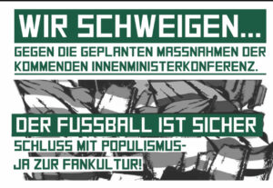 Wir fordern die Vereine auf, sich diesen Plänen mit allen zur Verfügung stehenden Ressourcen und Möglichkeiten zur Wehr zu setzen! Die Äußerungen der IMK und die geplanten Änderungen zerstören nicht nur freie Fankultur, sondern greifen auch massiv und unbegründet in die Vereinsstrukturen ein. Die jahrelange gute Arbeit der Vereine und ihrer Partner wird ohne tatsächlichen Anlass mit Füßen getreten, das Erlebnis Stadionbesuch durch Unwahrheiten und egoistische Politiker massiv in seinem Ruf geschädigt.Vereine: Es geht nur gemeinsam! Wir Fans haben letztes Wochenende über Rivalitäten, Farben und Ansichten hinweg eine starke Einheit gebildet und unsere Haltung zum Ausdruck gebracht. Nun seid ihr an der Reihe!